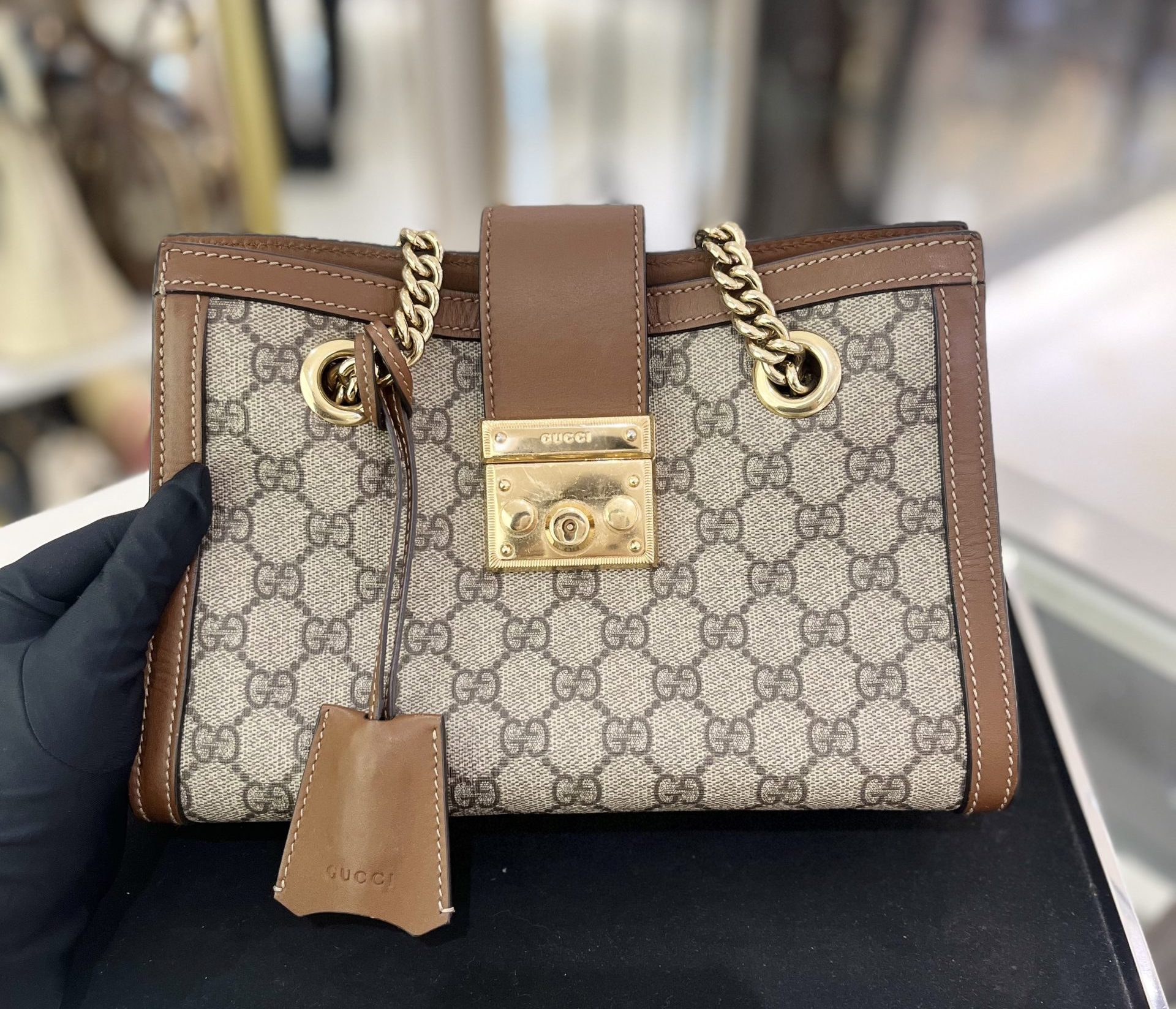 A structured shoulder bag in GG Supreme canvas with a strap that secures with a key lock closure pulled straight from the